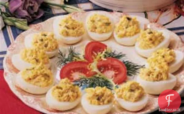 Se volete aggiungere altre ricette americane alla vostra collezione, le Uova alla Diavola con Granchio potrebbero essere una ricetta da provare. Una porzione contiene 126 calorie , 9 g di proteine e 9 g di grassi . Per 0,65 € a porzione , si ottiene un antipasto per 12 persone. Dalla preparazione al piatto, questa ricetta richiede circa 20 minuti . Solo poche persone l'hanno realizzata, e direi che ha fatto centro. È offerta da Taste of Home. Un mix di pepe, senape, maionese e una manciata di altri ingredienti sono tutto ciò che serve per rendere questa ricetta così saporita. È un'ottima opzione se state seguendo una dieta senza glutine, senza latticini, FODMAP e Whole30 . Tutto sommato, abbiamo deciso che questa ricetta merita un punteggio "cucchiaio" del 32% . Questo punteggio è piuttosto basso. Se ti è piaciuta questa ricetta, potrebbero piacerti anche ricette come la Zuppa di mais e granchio , le Uova alla diavola di Blasian e le Uova alla diavola con granchio .