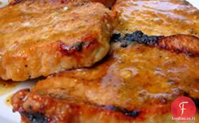 Mettere le costolette di maiale sulla griglia preriscaldata, e griglia fino a quando ben rosolato e non più rosa nel mezzo, circa 6 minuti per lato, bagnando le costolette di tanto in tanto con la marinata. Un termometro a lettura istantanea inserito nel centro dovrebbe leggere 145 gradi F (63 gradi C). Lasciare che la marinata imbastire per cuocere completamente sulle costolette.