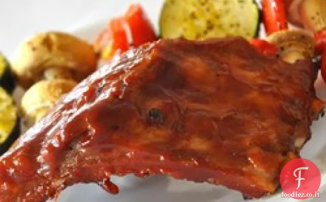 Spennellare le costole con metà della salsa barbecue. Cuocere in forno preriscaldato fino a quando la salsa è diventata appiccicosa e leggermente dorata, circa 7 minuti. Girare le costole e spennellare con la salsa rimanente. Continuare a cuocere fino a quando la salsa è diventata appiccicosa, circa 7 minuti.
