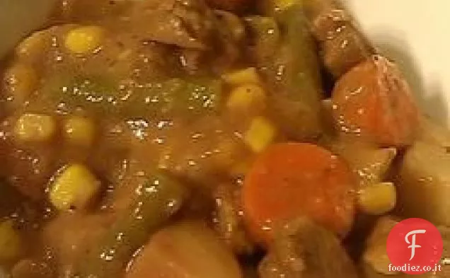 Versare il brodo, la birra, la salsa di pomodoro e il concentrato di pomodoro. Mescolare le patate, le verdure miste e il cavolo. Portare a ebollizione, ridurre il calore al minimo e far sobbollire 1 ora, mescolando di tanto in tanto.