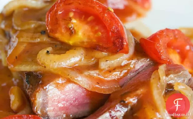 Bistecca scottata in padella con salsa di pomodoro e cipolla in agrodolce