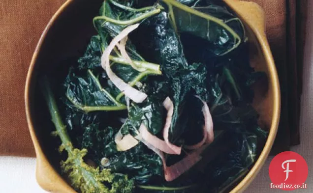 Portare l'acqua a fuoco lento in una grande pentola, quindi aggiungere cavolo, 1/2 cucchiaino di sale, e 1/4 cucchiaino di pepe e cuocere, scoperto, mescolando, fino a quando il cavolo è appassito e croccante-tenera e liquido è evaporato, 5 a 8 minuti. Condire con il composto di scalogno, quindi condire con sale e pepe.
