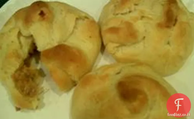 Mettere 1/2 tazza di miscela di carne al centro di ogni rettangolo. Portare quattro angoli al centro e torcere; pizzicare per sigillare.