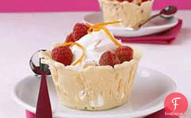 Mescolare la buccia d'arancia in topping montata; cucchiaio in modo uniforme in tazze di cioccolato. Top con i lamponi.