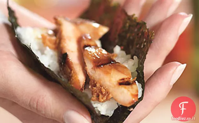 Avvolgere il pollo alla griglia con il riso appiccicoso in involucri Nori conditi.