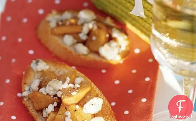 Toss pesche delicatamente con aceto. Crostini top con pesche e formaggio erborinato.