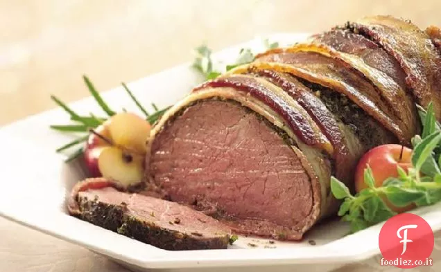 Mettere le fette di pancetta sopra la parte superiore di manzo, rimboccando le estremità sotto il fondo. Inserire termometro di carne così punta è nella parte più spessa di manzo.