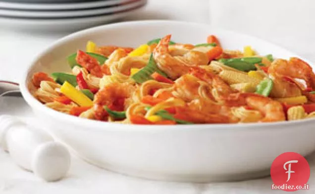 Cuocere la pasta come indicato sulla confezione. Toss gamberetti con amido di mais in una grande ciotola; lasciate riposare 10 min.