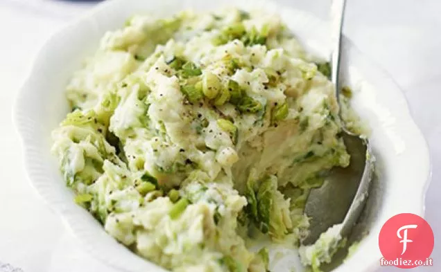 Capovolgere le patate nella loro padella, schiacciare, quindi aggiungere il latte e la miscela di germogli.