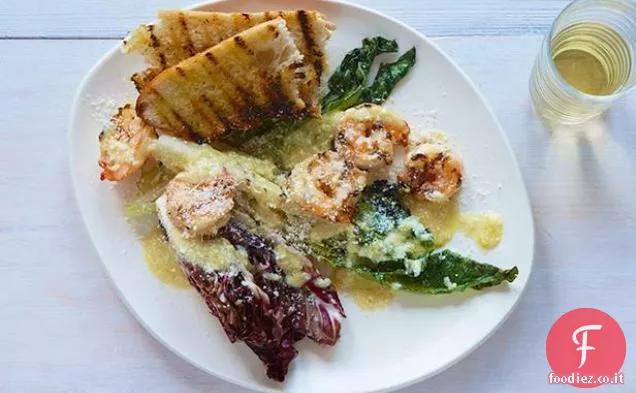 Per assemblare, dividere la romaine alla griglia e il radicchio tra 4 piatti grandi. Spargere una quantità uguale di gamberetti su ogni piatto e cospargere il tutto con il parmigiano rimanente.