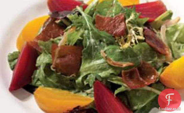 Insalata di primavera con barbabietole, prosciutto e salsa di cipolle cremosa