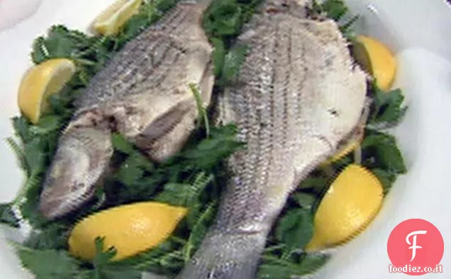 Mettere 1/2 di prezzemolo, aneto, limone e cipolla al centro della teglia. Assicurati che questo tumulo di aromatici sia abbastanza alto da impedire al pesce di toccare il fondo della padella. Strofinare il pesce dentro e fuori con 1 cucchiaio di olio. Condire il pesce dentro e fuori con il sale e pepe e giaceva sul letto di aromatici.