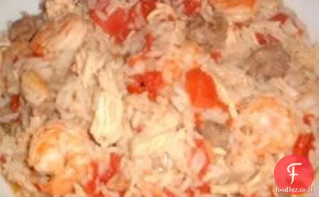 Selezionare un ambiente medio-alto per una padella elettrica; olio di calore in padella calda. Cuocere la cipolla in olio fino a renderla morbida. Mescolare pomodori, pollo e salsiccia. Condire con aglio in polvere, salsa piccante, sale e pepe. Mescolare il riso, versare il brodo e aggiungere i gamberetti.