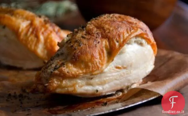 Unire il pangrattato di pecorino di capra, ½ dell'aglio tritato, prezzemolo, 2 cucchiaini di timo, erba cipollina, succo di limone, scorza di limone e acciughe (se si usa). Utilizzare una forchetta per schiacciare gli ingredienti insieme. Accantonare.Preparare il pollo: Lavorando 1 seno alla volta inserire delicatamente il dito sotto la pelle, facilitando la pelle lontano dalla carne per creare una grande tasca. Spoon circa ¼ del ripieno nella tasca. Lisciare delicatamente la parte superiore del pollo dall'esterno per distribuire il ripieno in tutta la tasca. Passare a una teglia foderata di pergamena. Ripeti con i seni rimanenti.