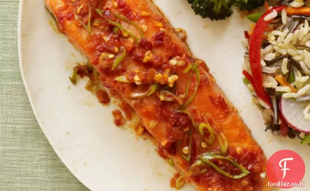 Il salmone glassato al peperoncino è un senza glutine, senza latticini, e pescatarian ricetta con 4 porzioni. Questo corso principale ha 246 calorie, 34g di proteine, e 11g di grasso per porzione. Per $3.84 per porzione, questa ricetta copre 25% delle vostre esigenze quotidiane di vitamine e minerali. 1 persona ha fatto questa ricetta e lo farebbe di nuovo. Dalla preparazione al piatto, questa ricetta richiede approssimativamente 45 minuti. Vai al negozio e prendi una bottiglia di salsa chili, filetti di salmone, salsa di soia a basso contenuto di sodio e poche altre cose per farlo oggi. Per utilizzare lo zenzero fresco si potrebbe seguire questo corso principale con il Biscotti allo zenzero fresco come dessert. Tutto sommato, abbiamo deciso questa ricetta merita un punteggio spoonacular di 90%. Questo punteggio è spettacolare. Ricette simili includono Salmone glassato al peperoncino all'aglio, Salmone glassato all'arancia con peperoncino dolce, e Salmone glassato al peperoncino ripieno di pesto asiatico.
