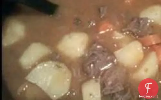 Cospargere la farina sul composto e mescolare per rivestire. Mescolare nel brodo, acqua, vino, sale, pepe, chiodi di garofano, salsa di pomodoro, prezzemolo e timo al composto; portare a ebollizione. Riportare il bisonte alla miscela e mescolare. Ridurre il calore; coprire e cuocere a fuoco lento fino a quando la carne è tenera forchetta, circa 1 ora.