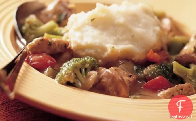 Aggiungere l'uovo; frusta con la forchetta fino a che liscio. Spoon le patate sopra la miscela di maiale bollente. Coprire e riscaldare per 5 minuti.